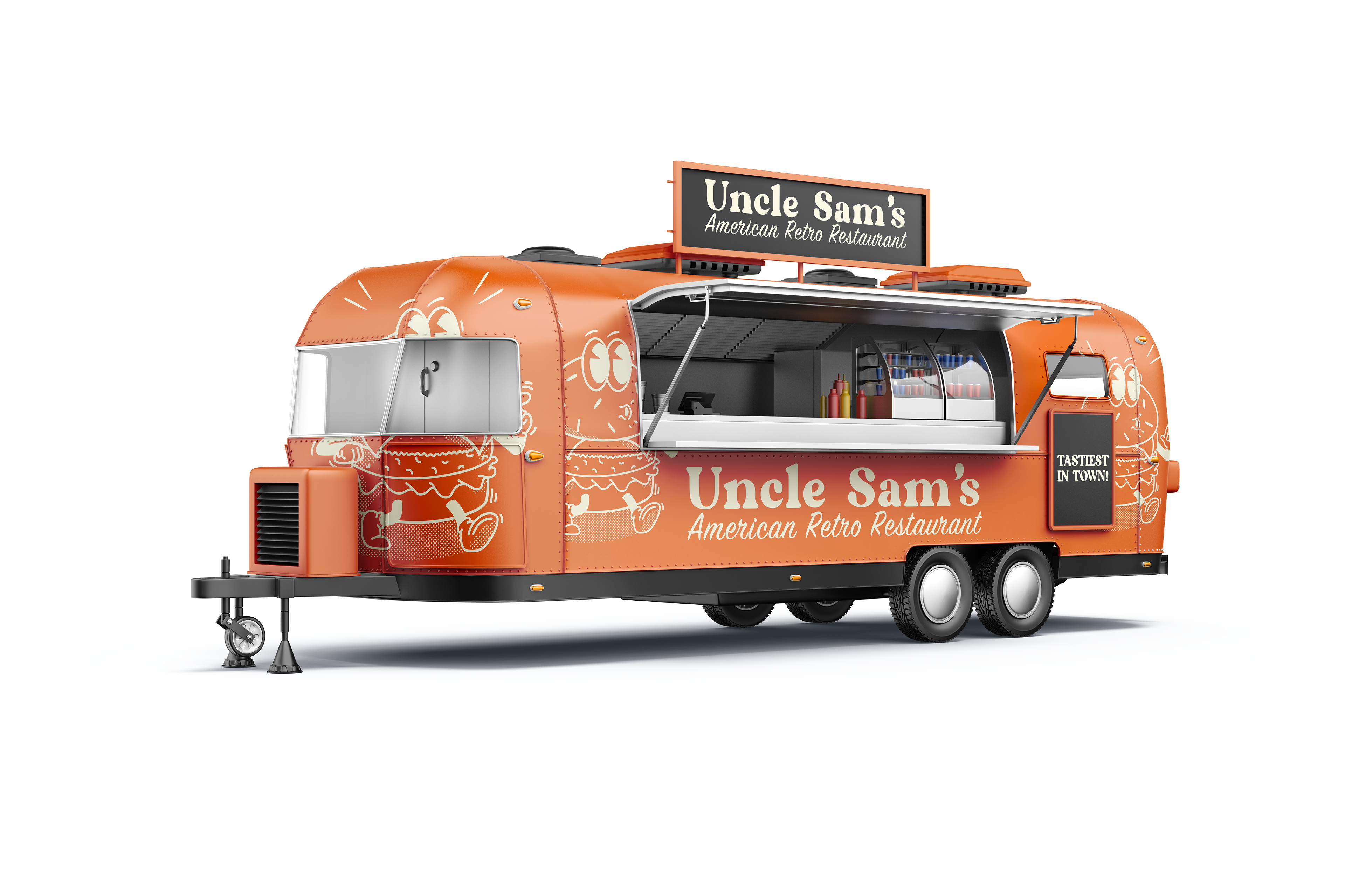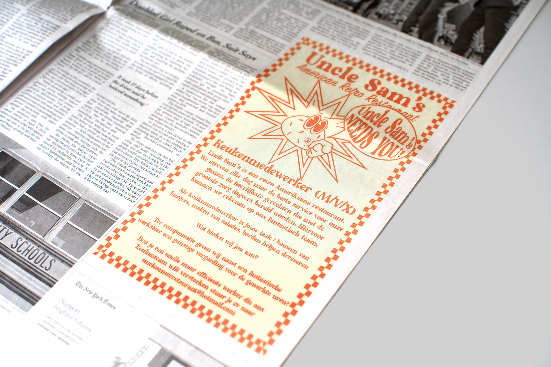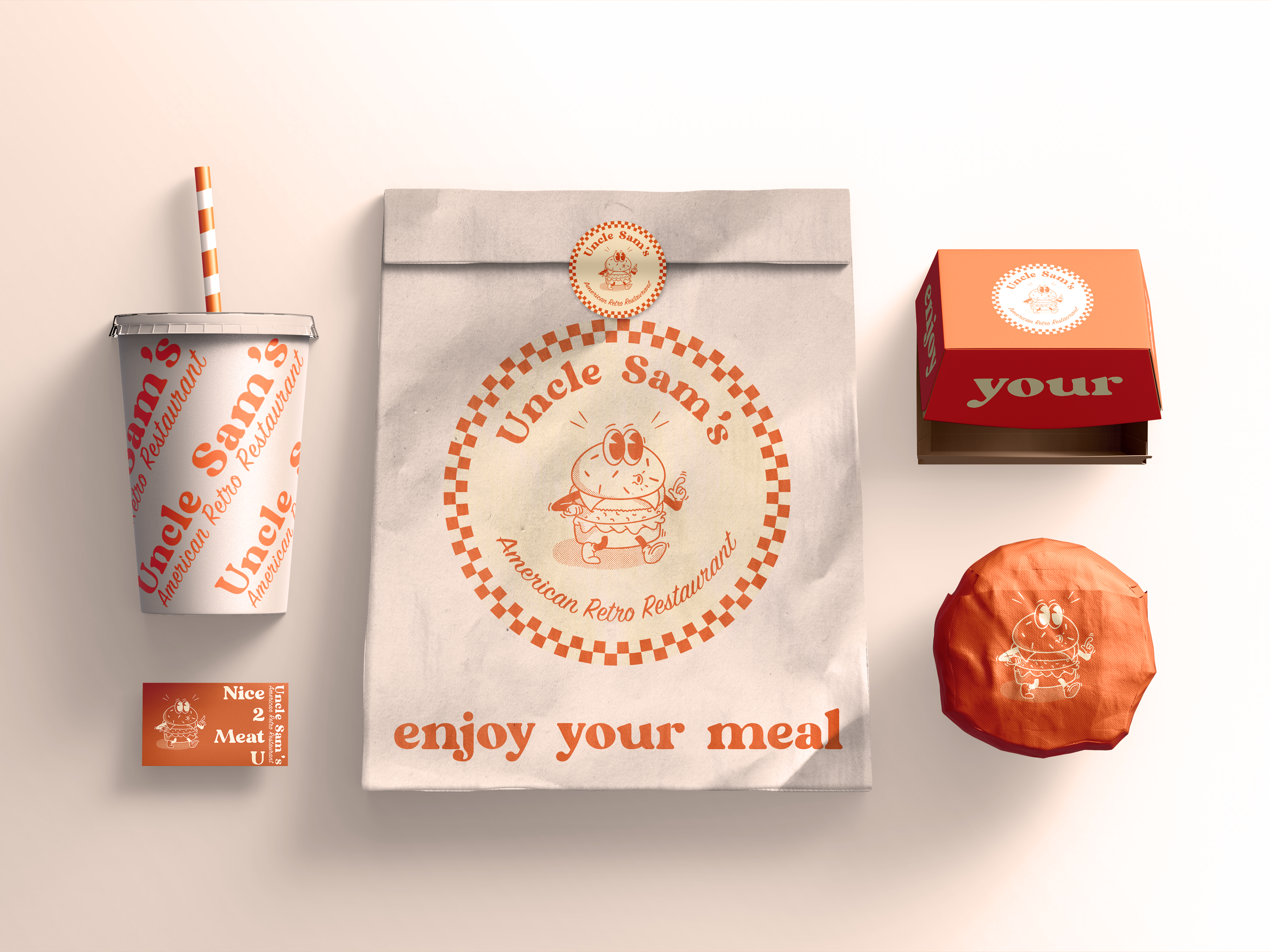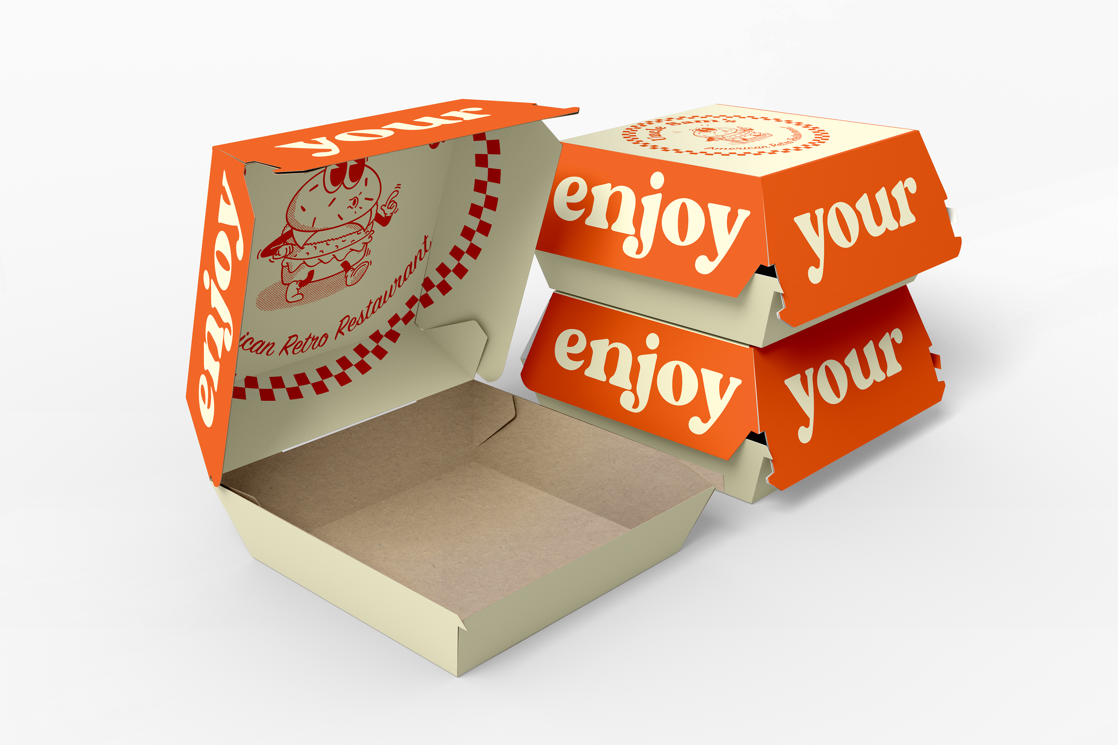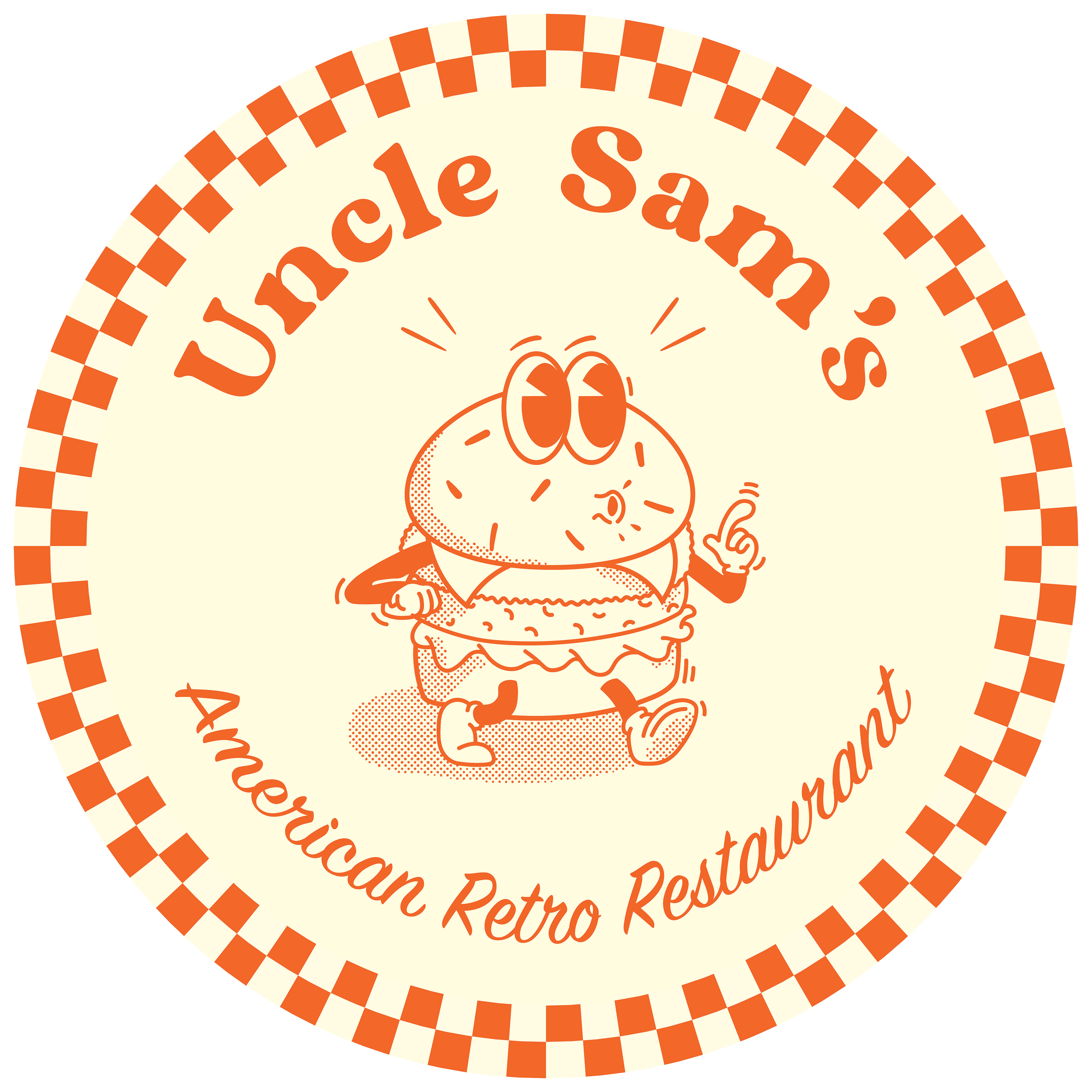 Voor mijn eindwerk als Grafisch Vormgever op Syntra kreeg ik de opdracht een bestaande huisstijl van een non-fictief bedrijf aan te passen en er een eigen twist aan te geven. Ik koos voor de Amerikaans gestylde diner in hartje Oostakker. Hun originele huisstijl was naar mijn mening een beetje cliché en kitscherig. Het had zijn charmes maar ik gaf er een volledige draai aan. Ik koos voor retro fonts en een rubberhose style mascotte. Gebroken wit en oranje waren de perfecte kleuren om dit plaatje helemaal te doen kloppen.